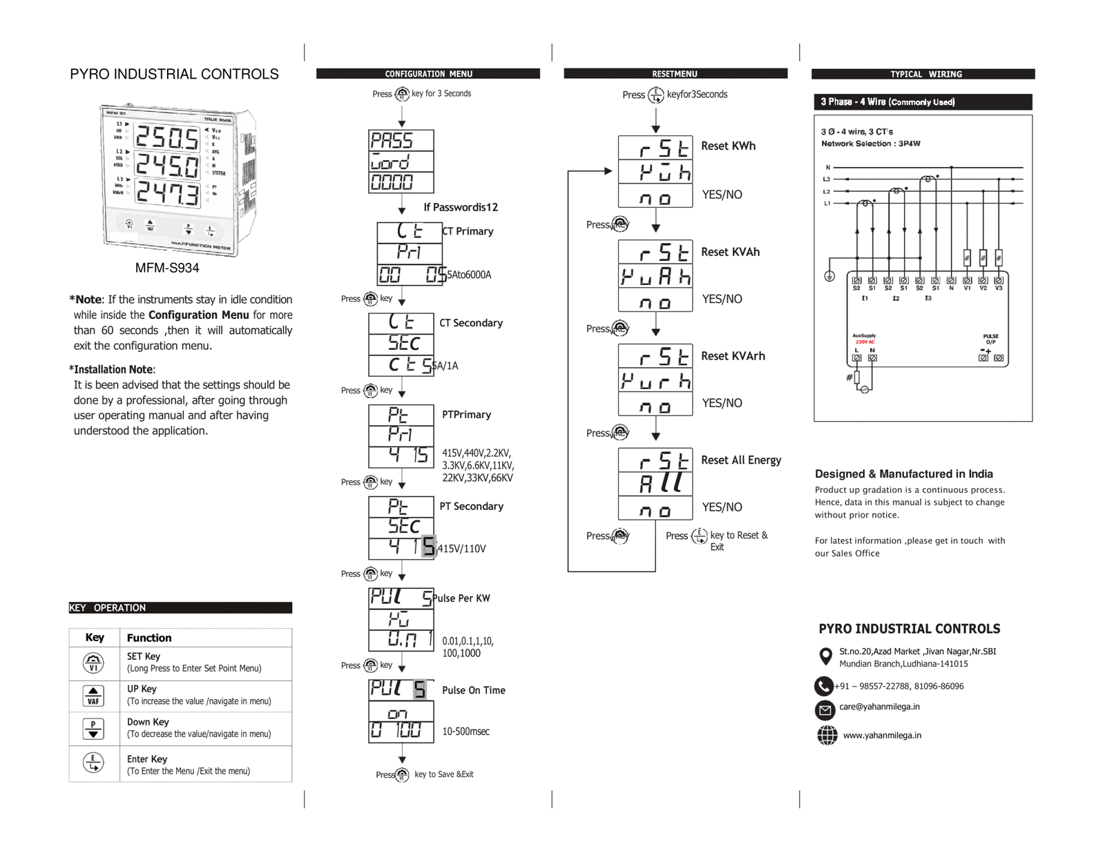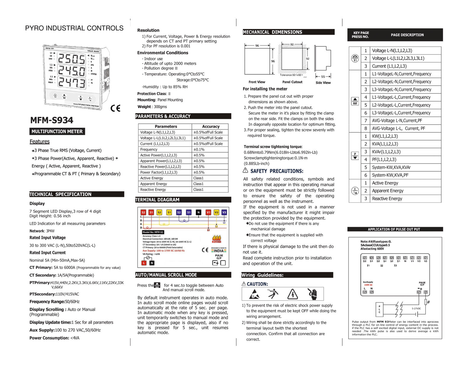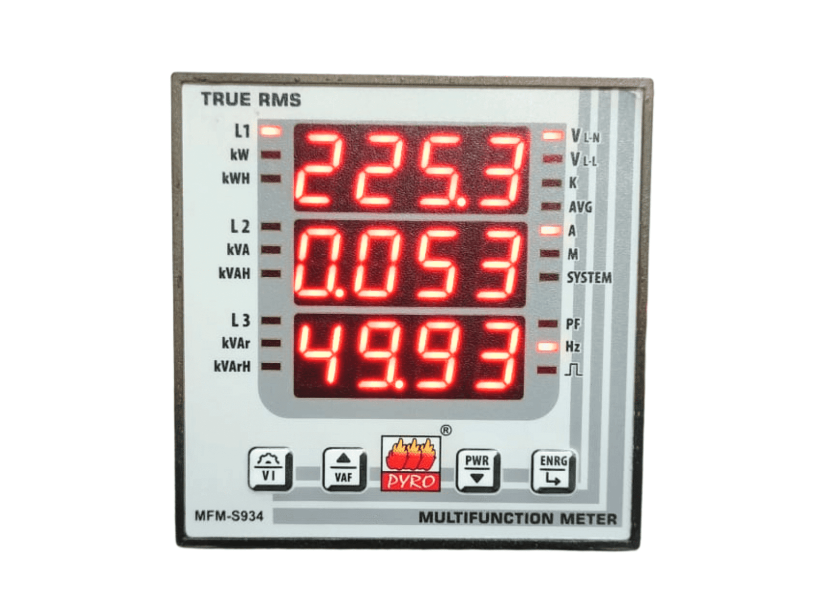 An 3 phase MFM (Multifunction Meter) is a digital device that measures and monitors multiple electrical parameters in an electrical installation, such as voltage, current, power (active, reactive, apparent), power factor, and energy. It works by sampling real-time voltage and current signals, processing them with a microcontroller, and displaying the data or transmitting it as digital signals. Pyro MFMs are used in industrial, commercial, and domestic settings to simplify electrical monitoring by replacing separate meters like voltmeters, ammeters, and wattmeter.